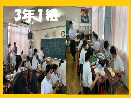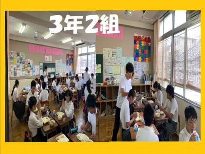 本日(4日)の給食は、ごはん、牛乳、さけのつけ焼き、みそ汁、とうがんの煮物、焼きのりでした。写真は、3年生の様子です。美味しくいただきました。(担当:田中)