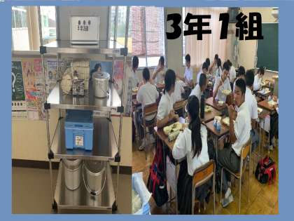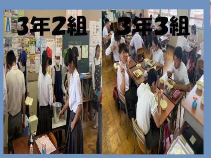 本日(9日)の給食は、牛乳、牛丼(ごはん)、とうがんのみそ汁、大福豆の煮物でした。写真は、3年生の様子です。今日も美味しくいただきました。
