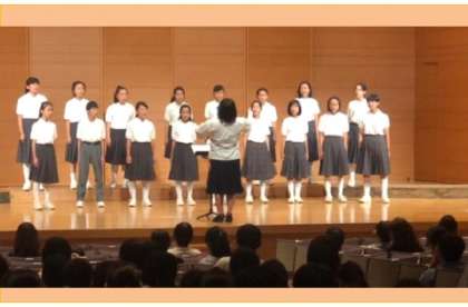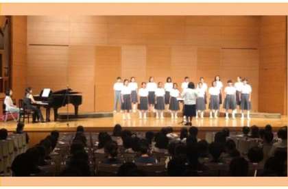 1曲目はNHKコンクールの課題曲でもある、SHISHAMOさんの「君の隣にいたいから」を歌い、2曲目は沖縄わらべうたの「てぃんさぐぬ花」をアカペラで歌いました。2曲とも日々練習に励んだハーモニーを会場に響かすことができました。