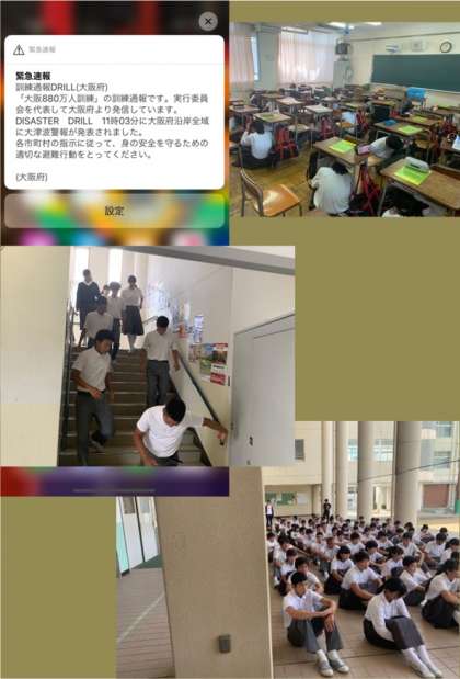 本日、予定されていた大阪880万人訓練と同時刻に、地震・それにともなう津波警報発生時に対しての避難訓練を実施しました。