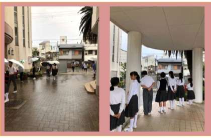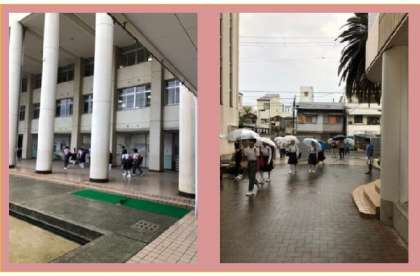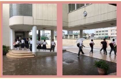 小雨が降る中、玄関では「おはようございます」と生徒、先生、職員の声が響きあっています。