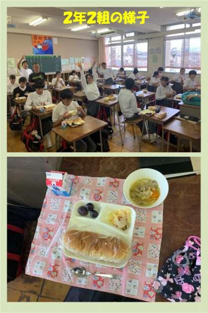 「パン」・「牛乳」・「鶏肉とてぼ豆のスープ煮」・「じゃがいもとトマトのチーズ焼き」・「ぶどう(巨峰)」でした。