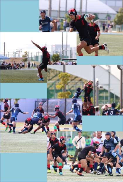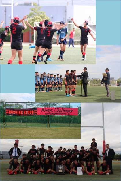 試合は白熱した展開で、相手大型センターの選手に何度もタックルで防ぎ、前半を終え12対5で折り返す。後半に入り、トライを入れられ同点に。でも、そこから執念で2トライを奪い、24対12で勝利、見事優勝!おめでとう!