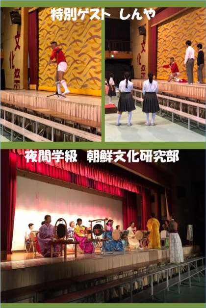 卒業生で吉本ピン芸人の「しんや」さんがサプライズで登場。今が旬のネタである、ラグビーを取り上げ、盛り上がりました。また、夜間学級の国際クラブ朝鮮文化研究部の皆さんがサムルノリを披露しました。