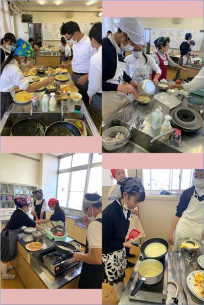 「クレープ」・「カスタードクリーム」・「オレンジゼリー」作りです。クレープを焼くのが難しかったみたいです。各グループ力をあわせて、何とかできました。