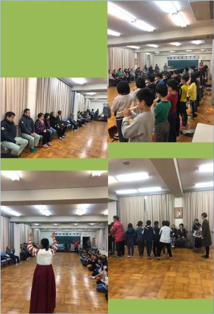 児童、生徒さんの代表の挨拶のあと、全員で「ウリナラコ」を歌いました。続いて、夜間学級生がサムルノリ、小路小からはリコーダー演奏を披露しました。最後はゲーム「カウィ バイ ポ」で大いに賑わいました。