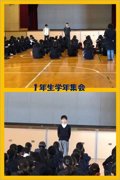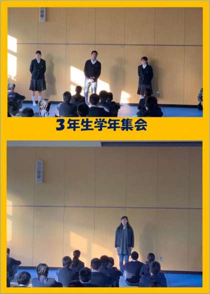 3年生の学年集会では、各班の班長がそれぞれ、学習法、授業の雰囲気の作り方、班学習への取り組み方などの話がありました。続いて、浦久保先生から寒くなるこれからの体調管理の仕方を話されました。