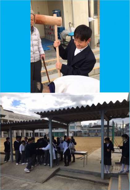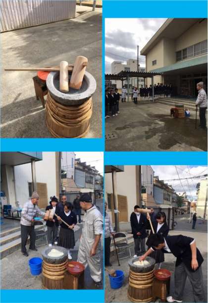 1年生は、5,6時間目にふれあい学習として、地域の方々が餅つきの用意をしていただき、餅つきを楽しみました。中には初めてつきたての餅を食べて、その美味しさに感動する生徒もいました。