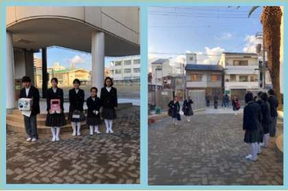 昨夜の雨はあがりましたが、冷え込んだ朝、正門では生徒会役員5人全員であいさつ運動と古切手の回収を行っています。