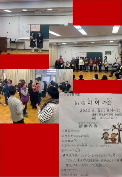 また、東中川小・小路小学校の民族学級6年生児童は、4月からともに東生野中学校へ進学し、ともに学ぶ仲間になることでしょう。また、様々な進路を考えている人にとっても、これからも生野区でつながっていく仲間だということを大切に思える時間にできればと思っています。短い時間ですが今日は楽しく、大切な時間を過ごしましょう。(担当:浦久保)