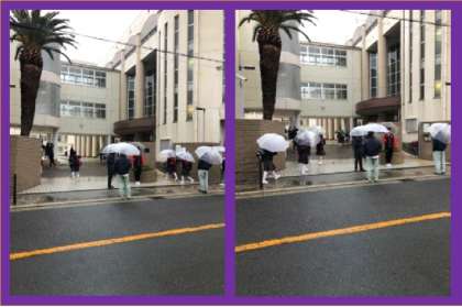 雨の中、正門ではいつもと同じく、先生・管理作業員さん・生徒会役員・風紀委員が朝の挨拶「おはようございます」と元気よく声かけをしています。