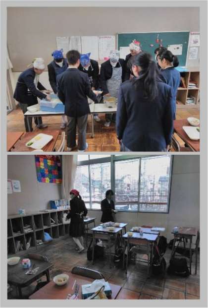 本日の給食メニューは、「かす汁」・「ブロッコリーのしょうがづけ」・「くりきんとん」・「豆こんぶ」・「ごはん」・「牛乳」でした。