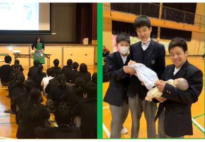 後半は、クラス毎に分かれて妊婦体験や赤ちゃんだっこなどの体験をしました。命が生まれるというのは本当に尊いことであり、自分たちが大きく成長できたのはお家の人や周りの人たちのおかげであることが今日のお話で分かりました。(担当:2年生、保健室)