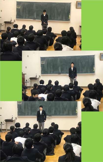 今日は、各クラスの2班からのお話でした。爪の適切な長さについて、残りの中学生活の過ごし方についてそれぞれ話がありました。