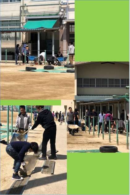 そんな中、先生たちは、運動場の側溝に溜まっている土を取り出し、運動場の整備に取り組んでいます。