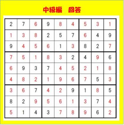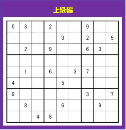 2 タテ列(9列あります)、ヨコ列(9列あります)、太線で囲まれた3×3のブロック((九つあります)のどれにも、1から9までの数字が一つずつ入るようにします。