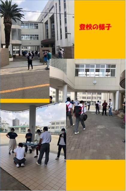 正門では、教職員が出迎え、健康観察表を提出させて、熱をはかっていない生徒には、検温します。