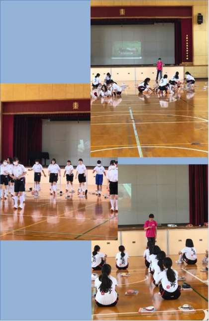 今日は男子がプール、女子は体育館で平泳ぎ泳法の地上訓練。