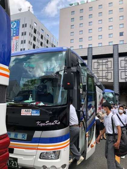 3台のバスに分かれて、唐津へ向かいます。