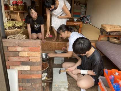 晩ご飯の買い出しのお手伝いを終え、桃の種を使って杏仁豆腐を作るそうです。