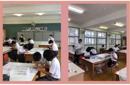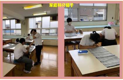 被服室での裁縫の授業です。ファイルフォルダーを「まつりぬい」、「千鳥がけ」で制作していきます。(担当:浦久保)