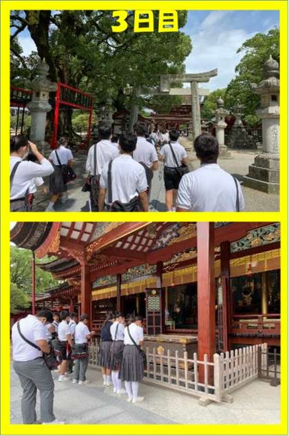 3日目の朝は台風一過の晴天で大宰府天満宮での参拝と班での自由行動ができました。途中、一時雨は降りましたが……。班で協力して行動することの大切さを学べたことと思います。そして、学問の神様として有名な大宰府天満宮に参拝したことでご利益があるでしょう。