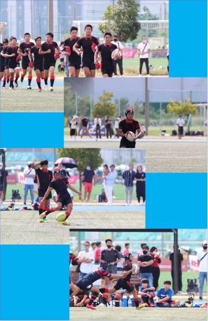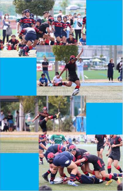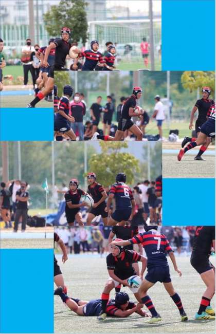 本校は、桃谷中学校(大阪市)と対戦、終始相手を圧倒、前半5トライ5ゴール35点、後半4トライ2ゴール24点、インターセプトで1トライを取られましたが59対7で準決勝に進みました。