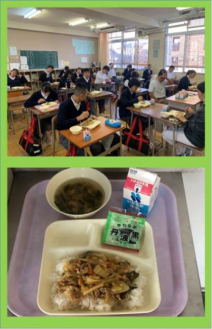 本日の給食メニューは、(ピリ辛丼)・(中華スープ)・(ソフト黒豆)・(牛乳)でした。