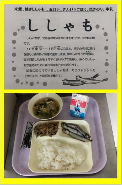 本日の給食メニューは、「焼きシシャモ」・「五目汁」・「きんぴらごぼう」・「焼きのり」・「ごはん」・「牛乳」でした。