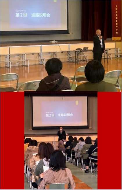 進路指導主事である福谷先生から、これからの進路に関しての予定や進め方が話されました。(担当:3年生)