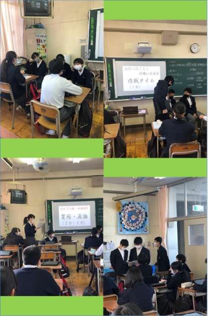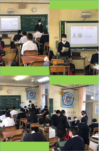 ディベートバトル(討論ゲーム)の授業で、生徒たちも積極的に意見交換をしていました。(校長)