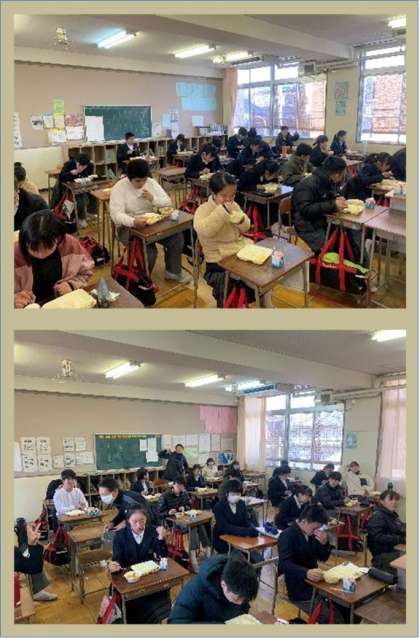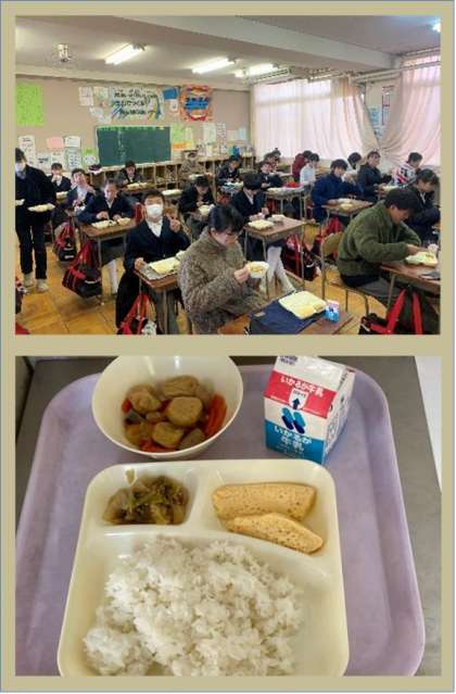 本日の給食メニューは、「卵とうふ」・「鶏肉と一口がんもの煮もの」・「野菜のそぼろ炒め」・「ごはん」・「牛乳」でした。