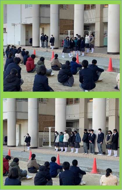 今週の木・金曜日に3年生は学年末テストがあります。最後のテストなので頑張ってください。また、コロナの感染者が増えています。手洗い、消毒、マスクの着用、ソーシャルディスタンスをしっかりしましょう。