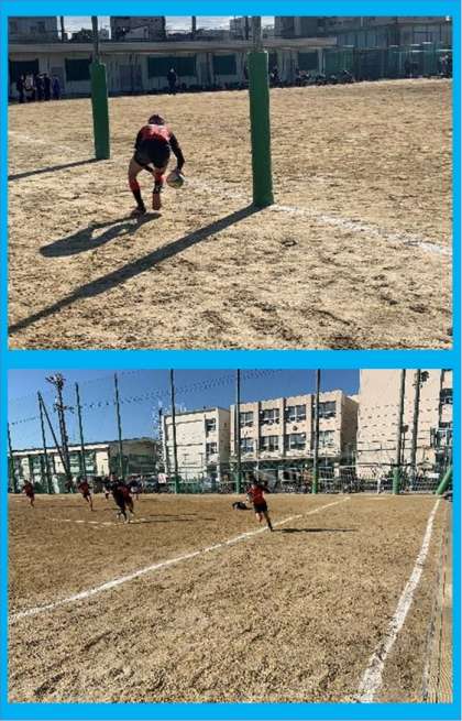 試合は終始相手チームを圧倒14トライ10ゴールの90点を獲得、守っては0点におさえBブロック1位で決勝トーナメントに進出しました。