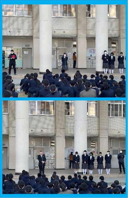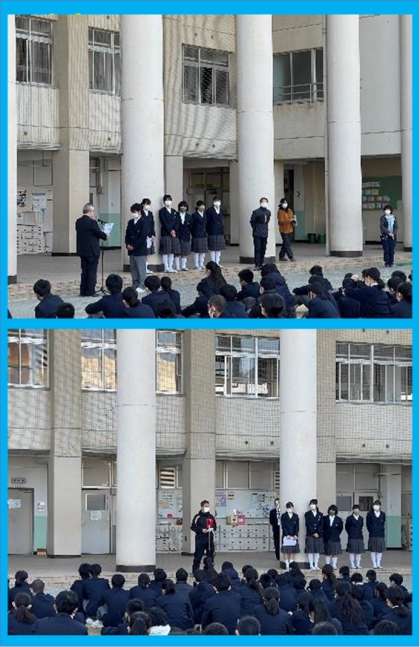 3月に入り一気に暖かくなり、青空の下、運動場で全校集会が行われました。