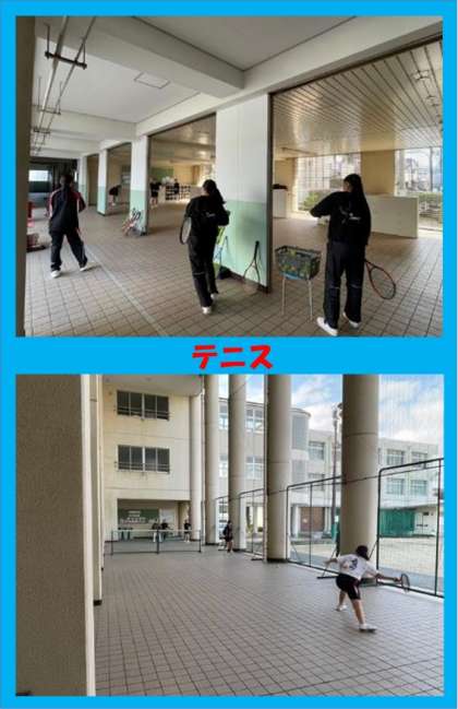 土曜日の午前中、運動場ではラグビー部が、体育館では女子バスケットボール部が、ピロティホールではテニス部が活動しています。