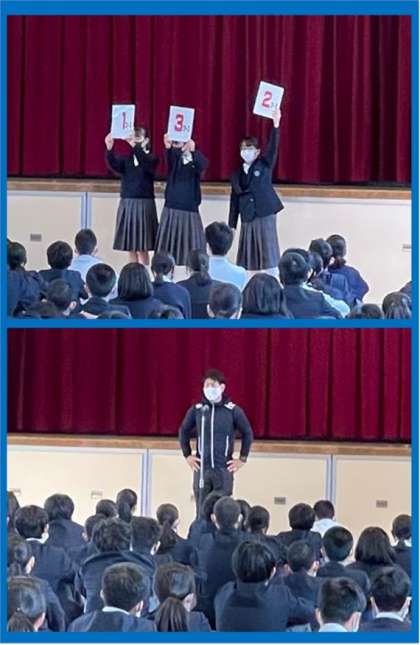 生徒会役員のあいさつの後、日下部先生から運動会のコースを決める抽選を3年生女子が代表して行いました。