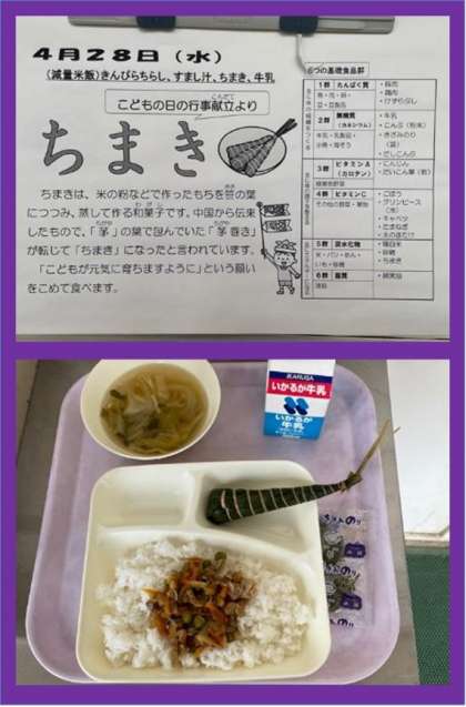 本日の給食メニューは、「きんぴらちらし」・「すまし汁」・「ちまき」・「ごはん」・「牛乳」でした。