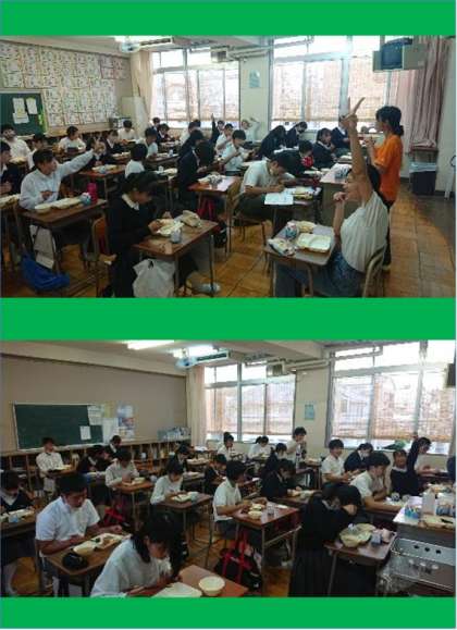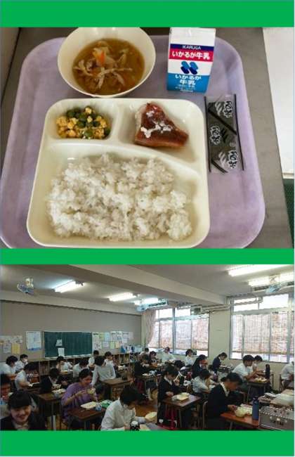 本日の給食メニューは、「赤魚のしょうゆだれかけ」・「みそ汁」・「えんどうの卵とじ」・「焼きのり」・「ごはん」・「牛乳」でした。