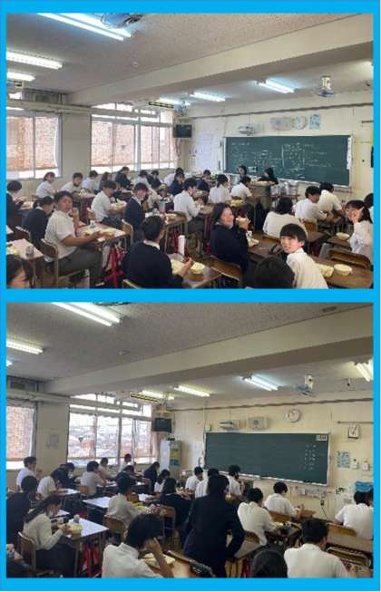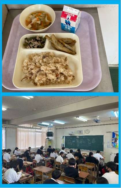 本日の給食メニューは、「いわしの天ぷら」・「五目汁」・「豚肉とさんどまめのいためもの」・「かやくご飯」・「牛乳」でした。「かやくご飯」は初めてのメニューでしたが、とても美味しくいただきました。