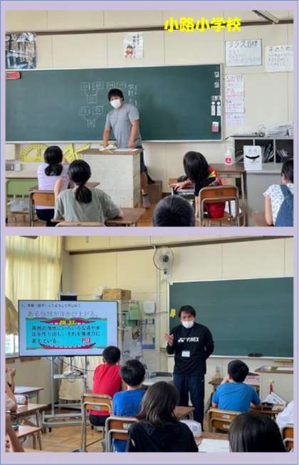 5年前から「かけはし事業」として取り組んでいます。本来は、期末テスト後の放課後に両小学校6年生に本校に来てもらって授業をする取組みですが、コロナ禍のため石原・上山先生は東中川へ、木藤・牧野先生は小路へ出向きました。