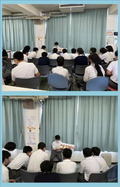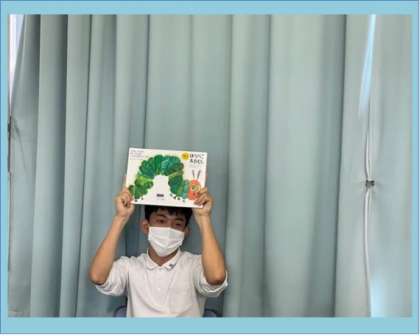 先週に続き2回目は3年生の八田佑介君が絵本「はらぺこあおむし」を読みました。雨で運動場が使用できなかったのが影響してか30人以上の生徒が集まり、熱心に聞いていました。