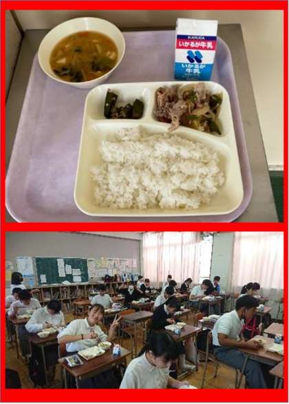 本日の給食メニューは、「豚肉の甘辛焼き」・「みそ汁」・「オクラのおかかいため」・「ごはん」・「牛乳」でした。