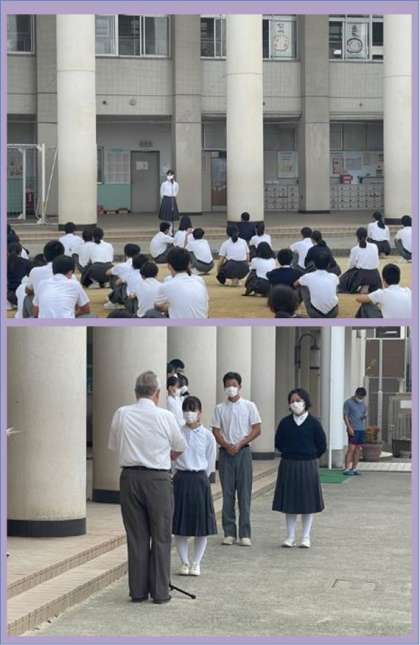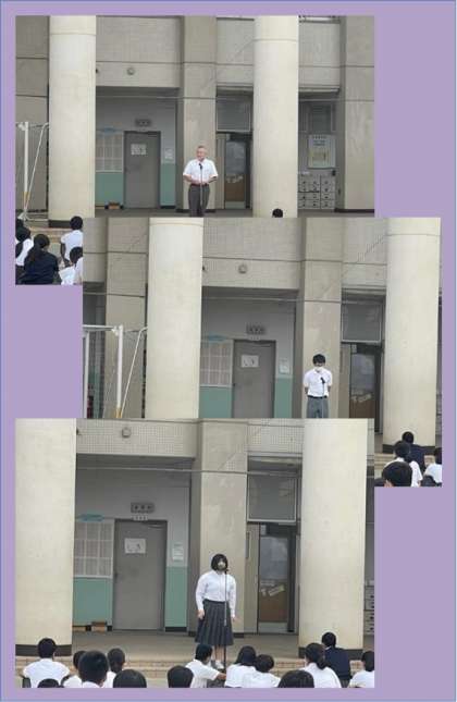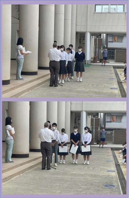 今、学級委員の認証式がありました。他の委員の人も、学級がよくなるように、しっかりがんばってください。今週金曜日は中間テストです。学校休業が続いたので、2日で行うところ、1日で行います。大変だと思いますが、自覚を持って計画を立てて学習してください。