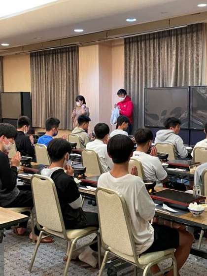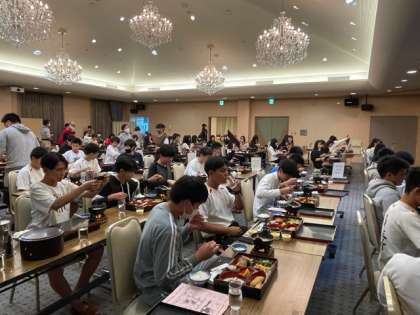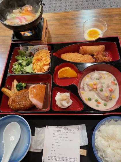 島原名物具雑煮、野菜サラダとパスタサラダ、魚フライ 春巻き 鳥唐揚げ、ハンバーグステーキ、ローストポーク、若鶏クリーム煮、肉シューマイ、ご飯、オレンジ ブラマンジェです。