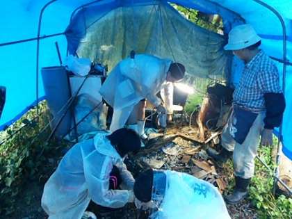 【上の写真】しいたけ菌の植付け作業