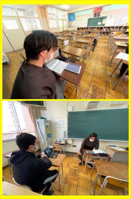 石原先生が2年生全員に対して、誰もいない1組の教室でリモート授業を行っています。田中先生がサポートしています。