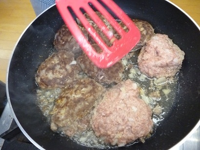 ぐつぐつ煮込むハンバーグ。ジュワーッと、とてもいい匂いが漂っていました。