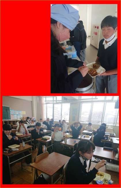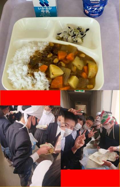 本日の給食メニューは、「牛肉と大豆のカレーライス」・「キャベツのひじきドレッシング」・「ヨーグルト」・「牛乳」でした。カレーは人気メニューです。