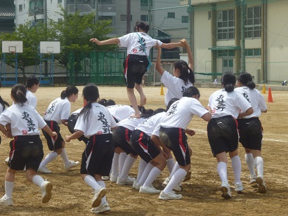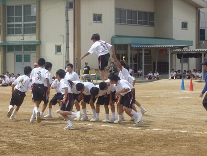 「いかだレース」。一人の生徒が、馬になっている背中の上を歩いて渡ると、ぐらぐらするいかだの上を歩いているように見えることから名づけられました。